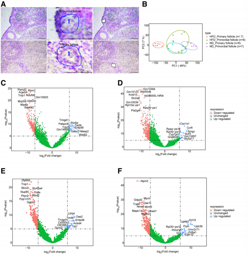 为了确定HFD小鼠原始卵泡衰竭的相关基因变化,本研究通过激光捕获显微切割收集了ND和HFD小鼠的原始卵泡和初级卵泡进行单细胞测序分析(图2A)。图2B的PCA分析区分了ND_原始卵泡、ND_初级卵泡、HFD_原始卵泡和HFD_初级卵泡组之间的差异。图2C和图2D的火山图分析了ND_原始卵泡和HFD_原始卵泡组(图2C)以及ND_初级卵泡和HFD_初级卵泡组之间的显著差异。在ND_原始卵泡中,细胞氧化应激水平和代谢相关基因,如Ndufb6、Mipep和Ube2m显著下调。在HFD_原始卵泡滤泡中,细胞氧化应激和代谢相关基因的水平,Tmigd1、Slx4ip和Masp2显著上调(图2C)。对于ND_初级卵泡,细胞增殖相关基因的水平,KCTD10、Slc2a8、Pla2g4f显著下调(图2D)。这些结果表明,HFD小鼠原始卵泡损耗的加速可能与细胞增殖、代谢和氧化损伤有关。