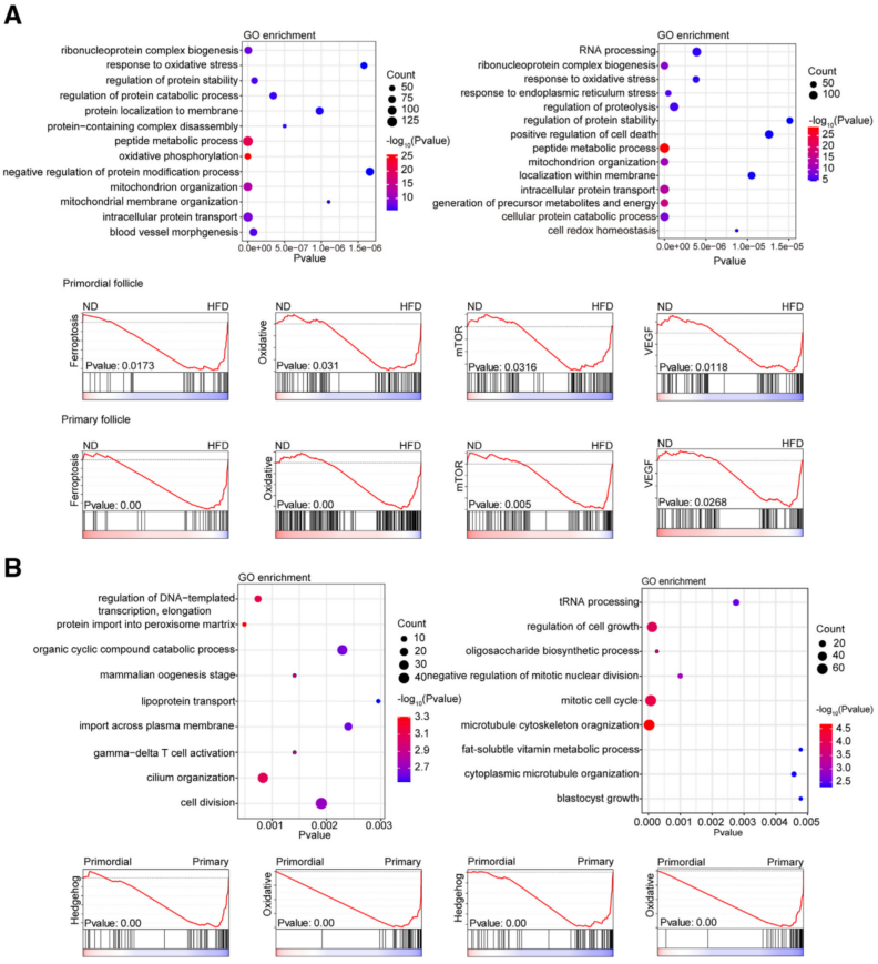 通过GO和GSEA分析比较ND和HFD小鼠的原始和初级卵泡(图3)。GO分析显示在HFD小鼠的原始和初级卵泡中,氧化应激、肽代谢和线粒体组织反应显著富集(图3A)。此外,与HFD小鼠的原始卵泡相比,ND小鼠的初级卵泡中的血管形态下调。GSEA的功能通路富集结果显示,在HFD小鼠的原始卵泡和初级卵泡中,铁死亡、细胞氧化应激、哺乳动物雷帕霉素靶点(mTOR)信号传导和血管内皮生长因子(VEGF)显著富集。这些信号通路可能介导原始卵泡向初级卵泡的转变,也可能是肥胖导致原始卵泡耗竭增加的分子机制。