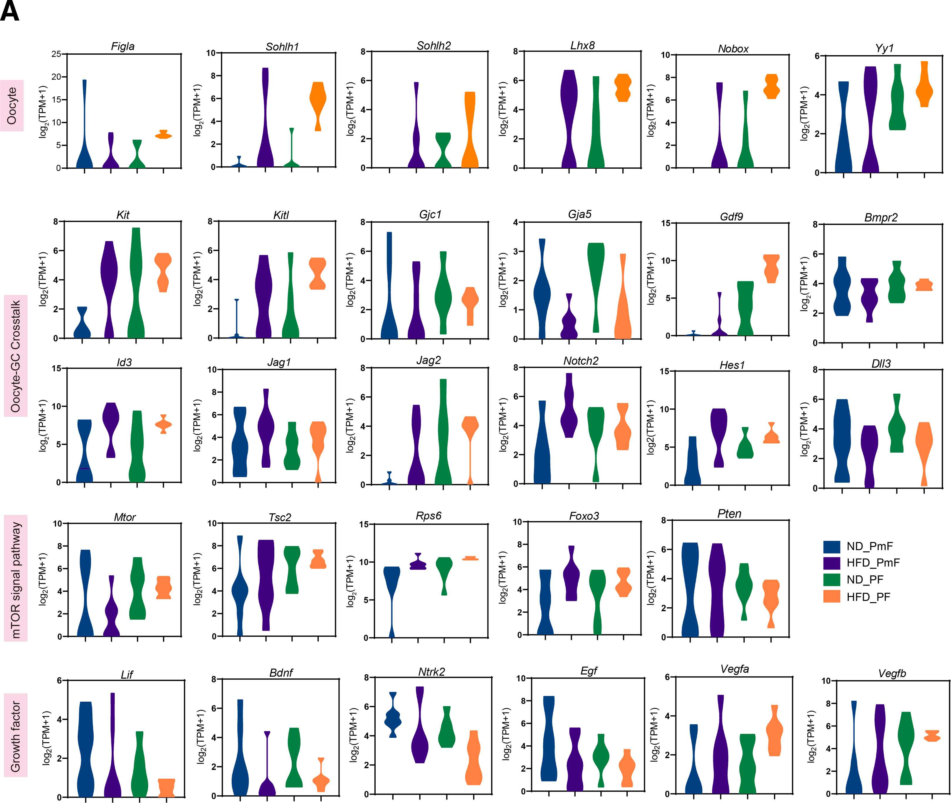 为了研究PPT过程中卵母细胞与颗粒细胞之间的相互作用,分析了卵母细胞特异性转录因子、卵母细胞-颗粒细胞交互(包括KITL/KIT信号通路、间隙连接、notch信号通路和TGFb信号通路)、mTOR信号通路和生长因子的表达,结果显示,HFD小鼠的PPT速率加快。 数据显示,igla、Sohlh1、Lhx8、Nobox、YY1、Kit、Kitl、Bmpr2、Id3持续高表达。Gjc1、Gja5、Jag1、Notch2、Hes1、Dll3的表达水平降低。mTOR信号通路也广泛参与PPT,其中mTOR、Tsc2、Rps6、Foxo3的表达水平高于PTEN的水平。