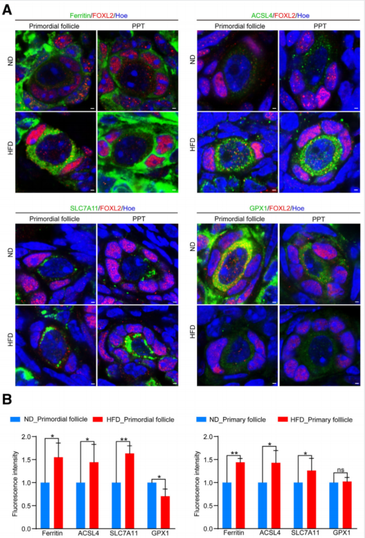肥胖现已成为一种常见疾病,会增加生殖内分泌疾病的风险,包括男性性征异常、多囊卵巢综合征(PCOS)、流产和不育等。原始卵泡是雌性哺乳动物生殖细胞的存在形式,原始卵泡有三种命运:激活成熟、保持休眠状态(大部分细胞)和直接死于休眠状态。在生理和病理条件下,原始卵泡的死亡和激活都是原始卵泡耗竭的表现,然而原始卵泡衰竭的主要原因尚不清楚。铁死亡是铁依赖性磷脂(PL)过氧化调节的细胞死亡的一种形式,脂质和致命活性氧的过度积累导致铁死亡。卵巢单细胞RNA测序显示,围产期卵母细胞丢失与铁死亡有关。然而,铁死亡在原始卵泡向初级卵泡转变(PPT)中的作用及其对原始卵泡消耗的作用仍然未知。本研究在建立小鼠肥胖模型的基础上,结合卵巢组织激光切割获得个体原始卵泡和初代卵泡,发现肥胖小鼠原始卵泡向初级卵泡转变(PPT)期铁死亡信号通路成分显著升高。