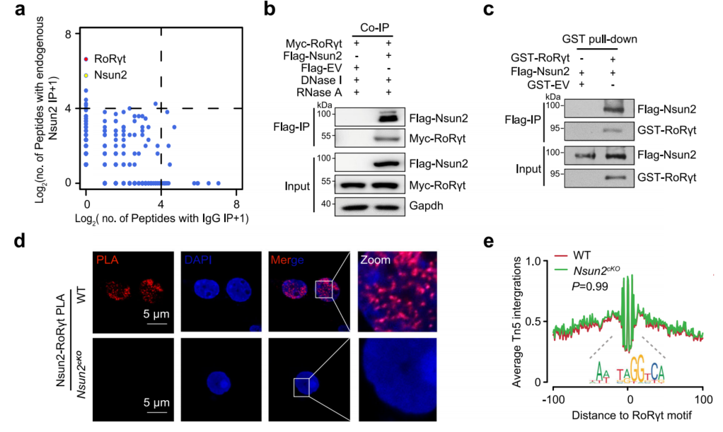 转录因子RoRγt在Th17细胞中与Nsun2内在相互作用的候选蛋白中排名第一,与Nsun2有强烈的相互作用(图2a)。Co-IP和体外GST-pull-down证实了Nsun2和RoRγt之间的直接相互作用(图2b,c)。PLA和免疫荧光显示Nsun2与细胞核中的RoRγt相互作用(图2d)。ATAC-seq测定了染色质可及性的变化,结合野生型Th17细胞的公开RoRγt ChIP-seq数据,发现RoRγt结合与Th17细胞中发现的开放染色质区域相关。Nsun2不影响RoRγt的染色质结合效率,也不影响caRNA的丰度。总之,尽管Nsun2缺失与转录因子RoRγt直接相关,Nsun2缺失对其染色质可及性和整体基因转录没有影响。