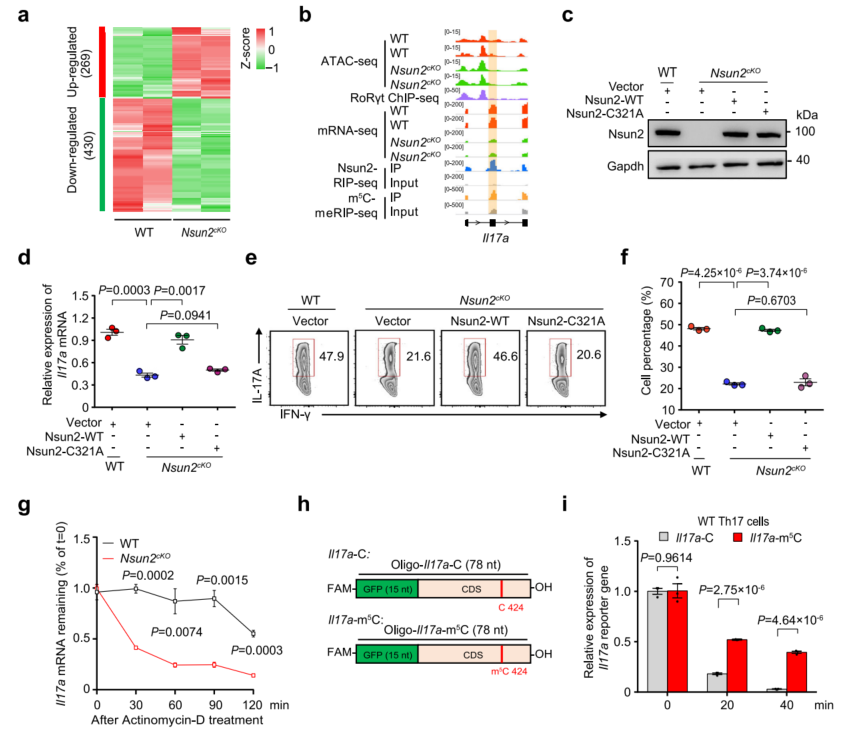 对野生型和缺乏Nsun2的Th17细胞的进行了RNA-seq,40%的下调基因是Nsun2靶向的,并被m5C修饰。构建了野生型Nsun2-WT和突变型的Nsun2(Nsun2-c321a)(图3c)。过表达Nsun2可以挽救Th17细胞中Il17a和Il17f mRNA水平的下降(图3d)。野生型Nsun2也挽救了Nsun2cKO中IL-17A+ Th17细胞的减少(图3e,f)。这些发现表明,Nsun2固有的甲基转移酶活性对于Th17细胞的产生和功能维持至关重要。Nsun2的缺失显著加速了Il17a和Il17f mRNA的降解(图3g)。合成了两个迷你基因报告基因:Il17a-C(未修饰C)和Il17a-m5C(图3h),Il17a-m5C报告RNA比Il17a-C报告RNA更稳定。综上所述,Nsun2通过调节依赖于m5C修饰的关键细胞因子mRNA的稳定性来维持Th17细胞的稳态。