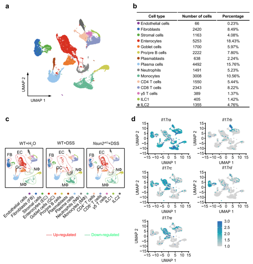 为了揭示Nsun2在结肠炎微环境中的调控途径,对野生型和Nsun2cKO小鼠的结肠进行了单细胞RNA-seq分析。单细胞谱被划分为15个亚群,细胞计数从66到5253(图6a,b),其中上皮细胞(24.4%)和B细胞(25.8%)是富集程度最高的两个亚群。在野生型组中,发现15种细胞类型中有9种在结肠炎期间发生了异常变化,这些异常变化大部分可以通过Nsun2耗竭来逆转(图6c)。所有获救的细胞类型都表达IL-17受体(图6d)。这些结果表明,T细胞特异性Nsun2的缺失,通过优先逆转表达IL-17受体的细胞的病理改变,从而阻碍结肠炎的发展。