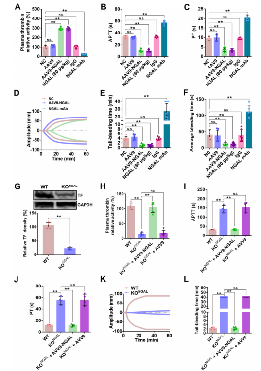 为了进一步证明NGAL在凝血止血中的关键作用,对NGAL敲除小鼠进行凝血止血实验。NGAL基因敲除的显著降低血管的TF表达和循环血浆TF,血浆凝血酶活动,MA值,和长时间R,K,APTT、PT、和tail-bleeding时间(图4G-L)。过表达的AAV9-NGAL补充了NGAL缺失,可以逆转NGAL敲除小鼠的这些变化(图4H-J、L)。NGAL敲除对血浆铁浓度无影响,表明其相关凝血表型与铁相关凝血途径无关。这些结果共同表明NGAL在凝血和止血中起着至关重要的作用。