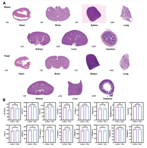 为了全面评价MOF - 818 @ UDPG / ASGR1的长期生物安全性,进行了系统的体内毒理学评价。健康小鼠尾静脉注射MOF - 818 @ UDPG / ASGR1 ( 10μg / mL、200 μ L)后,与对照组(给予等体积生理盐水)相比,其主要脏器(心、脑、脾、肺、肾、肝)经H&E 染色未见明显病理损伤(图4A)。此外,在MOF - 818 @ UDPG / ASGR1完成1周治疗后4周,对MASLD小鼠模型进行了全面的血清分析,结果显示,血清生化指标(ALT, AST, CRE 等)及炎症因子水平与对照组无异,表明体内安全性良好(图4B)。该研究结果表明,MOF-818 @ UDPG / ASGR1不会导致可检测的急性或长期毒性,肯定了其在体内应用的出色的生物安全性。