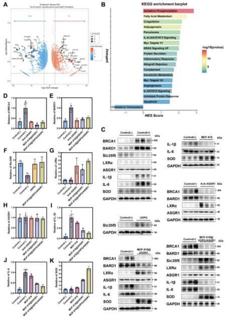 为了阐明MOF - 818 @ UDPG / ASGR1改善肝脏脂肪变性的分子机制,对MASLD假治疗和MOF - 818 @ UDPG / ASGR1治疗小鼠的肝脏组织进行转录组测序( RNA-seq )。火山图和PCA 分析显示治疗组与模型组明显分离,表明基因表达发生全局性改变;GSEA 分析进一步显示:胆固醇稳态通路被激活(支持 LXRα 功能);IL-6/JAK/STAT3 等炎症通路被抑制;脂滴相关基因(Plin4, Cidec)、P450 酶(Cyp4a14)等致病因子下调(图8A-B)。Western Blot 证实该处理特异性增强BRCA1 / BARD1复合物,并激活其下游靶标LXR α(图8C-E),同时 SLC35F5 蛋白的上调支持了 UDPG 通路的激活,显著降低TNF - α、p - NF - κ B p65和IL – 6蛋白表达水平(图8F–K)。该部分综合表明:ASGR1 触发信号传导 + UDPG 抑制新生脂 + MOF 清除 ROS,三者协同发挥作用。